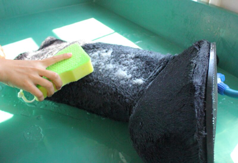 デアでは、着ぐるみの構造を踏まえたうえで、丸洗いできるパーツにはたっぷりの水を通し、内部の汚れを浮かせる工程を行います。